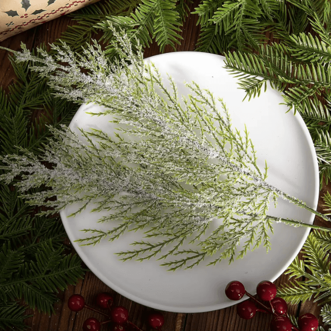 Snowy artificial pine branches are a beautiful way to bring winter’s natural charm indoors. With their frosted, snow-dusted tips and rich evergreen texture, these branches instantly create a cozy, wintery atmosphere. Placed in a vase, they add height, elegance, and a soft seasonal touch to entryway tables, mantels, or coffee tables. Perfect for achieving a snowy woodland look that lasts all season, they offer the beauty of winter greenery with none of the maintenance.